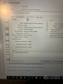 Vendo HP Victus 16-e0002sl, un vero PC da gaming potente e affidabile, perfetto sia per giocare che per lavoro creativo. Specifiche principali: •CPU: AMD Ryzen 7 5800H (prestazioni elevate) •RAM: 16GB •SSD: 512GB NVMe PCIe M.2 (veloce e reattivo) •GPU: NVIDIA RTX 3050 Ti 4GB •Display: 16,1” FHD IPS 144Hz (fluidità top nei giochi) •Wi-Fi 6 + Bluetooth 5.2 •FreeDOS •Colore: Grigio Prestazioni: Gioca tranquillamente a qualsiasi titolo moderno con ottime impostazioni grafiche e fluidità. Perfetto per Fortnite, Warzone, GTA V, Valorant, FIFA, e tanti altri. Condizioni: Usato pochissimo, perfettamente funzionante. Presenta qualche leggero segno estetico, ma nulla che influisca su prestazioni o utilizzo. Prezzo di vendita: 400€ (leggermente trattabile) Pagato 1100€, ottimo affare per chi cerca un gaming laptop serio a prezzo basso.