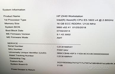 Workstation Hp Z440 perfettamente funzionante, Cpu E5 1603 V4 2.8GHZ, 16GB DDR4 ECC 2133Mhz, Hard disk SSD 480GB , + secondo Hard disk 320GB/500GB/1TB meccanico, Scheda video Nvidia K620 2GB DDR4 uscita display port + DVI, lettore di schede Sd/microSd/CF ,scheda di rete, scheda audio, masterizzatore slim CD/DVD. Tastiera e mouse. Disponibili a parte anche display 22/24 poliici LCD.