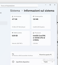 HP Pavilion x360 14-dh1007nl Ibrido (2 in 1) Intel Core i3-10110U 2.1GHz 8Gb ddr 4, disco ssd 500 Gb , display 14", sistema Operativo Windows 11, 2 in 1 convertibile a Tablet, funziona perfettamente, nessun segno di usura e nessun difetto, molto veloce e silenziosissimo, comodo per studenti per il suo touch screen e convertibile Tablet orizzontale o verticale. Molto sottile e maneggevole, facile da trasportare. Costava euro 800, vendo a prezzo affare euro 250 non trattabile. Non scambio