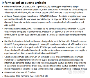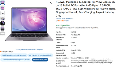 Vendo Notebook portatile Huawei MateBook 13 usato ma in ottime condizioni solo leggerissimi graffi scocca( veramente leggerissimi lo scrivo solo perchè voglio la precisione). Scheda tecnica: Laptop FullView, Display 2K, 13 Pollici, AMD Ryzen 7 3700U, 16GB RAM, 512GB SSD, Si vende solo Laptop e Caricabatterie marca HP