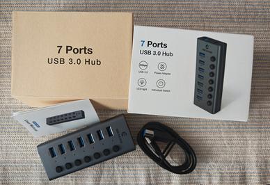 Hub USB 3.0 5Gbps in alluminio con alimentatore di rete 120cm o cavo per pc 100cm, HB052 USB a 7 porte, con interruttore on/off individuale. Nuovo completo di tutto Ideale anche per caricare smartphone, smartwatch, etc collegandolo alla presa di corrente a muro Scambio a mano a Verona o Brescia oppure spedisco.