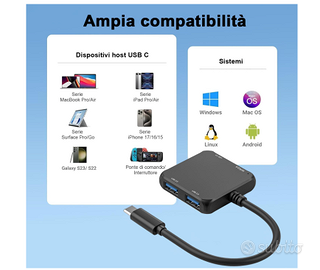 Vendo Hub USB 4 in 1 adattatore Tico c 100w 4 uscite per Mac , iPhone . Nuovo con scatola. Hub usbc con 4 uscite . 3 USB A 1 USbc . 100w 5gbps supporto per trasferimento dati e collegamento periferiche . Come game pad , cellulare , tablet , scanner , stampante, mouse , tastiera , hard disk , chiavette etc. Plug and play . Super compatto 3cm x 3 cm . Ultra veloce con uscita USB 3.0 . Funziona per MacBook tutte le serie , per iPhone dal 13 al 17 , per ipad dal 2019 in poi , per Samsung serie s dal s22 al 25 filp e fold , switch, surface etc. Supporta Mac os , Windows, Linux , android . Plug and play , anche per laptop vari e PC fissi . Cavo ingresso usbc