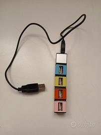 Hub USB usato con quattro porte, ideale per espandere le connessioni del tuo computer. Design colorato e compatto.
