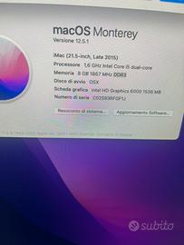 Vendo Imac 2016 21.5 inch, processore 1.6 Ghz i5 dual-core, memora 8gb. Vendo per passaggio a macbook