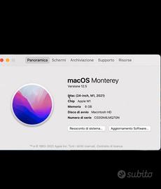 iMac 24” Apple M1 (2021) – pari al nuovo Vendo iMac 24 pollici con chip Apple M1 (modello 2021), acquistato nuovo da me e utilizzato pochissimo (circa 6 mesi). Condizioni pari al nuovo, sempre tenuto con cura. ✔ Chip Apple M1 veloce e fluido ✔ 8GB RAM ✔ SSD 256GB ✔ Display Retina 4.5K Completo di: * Tastiera Apple originale * Mouse Apple originale * Scatola originale (anch’essa in condizioni perfette, senza segni) 🔒 Nessun blocco iCloud – inizializzato e pronto all’uso Prezzo: 590€ leggermente trattabili (pagato oltre 1.400€ all’acquisto) Disponibile spedizione sicura tramite Subito Disponibile anche videochiamata per prova Vendo per inutilizzo. Preferibile ritiro a mano, disponibile per qualsiasi verifica. Prezzo già competitivo, valuto solo offerte sensate.