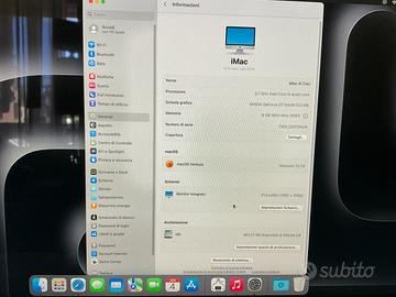 Imac 2012 in BUONE CONDIZIONI FUNZIONANTE con sistema operativo VENTURA 13.7.8 come da foto . 21,5 monitor 8gb 1 Tera di memoria Modello 13,1 Possibilita di prova senza problemi cosi da provare il prodotto Cavo di alimentazione compatibile ma non originale È gradita la consegna a mano cosi da evitare danni causati dal trasporto in quanto non possiedo la scatola originale