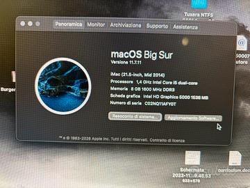 Vendo causa inutilizzo imac 21,5 pollici con intel i5 e 8gb ddr 3 , 1tb di memoria ssd , il pc funziona perfettamente ,ha solo una lieve incrinatura nella parte inferiore del lato dx del display . vedi foto allegata.