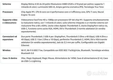 iMac con chip M1: CPU 8 core, GPU 7 core, display Retina da 24", 8GB di RAM, 512GB di archiviazione SSD. Compatibile con iPhone/iPad.