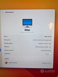 Vendo iMac 21,5 pollici retina 4K del 2017 in ottime condizioni estetiche funzionali (praticamente nuovo) Processore Intel core i5 quad-core 3,4 GHz -GPU: radeon pro 560 con 4 GB dedicati - memoria: 8 GB DDR4 a 2400MHz - Archiviazione 1 TB Nessun difetto al display, struttura integra, funzionamento regolare, inclusi cavo di alimentazione e accessori tastiera e mouse