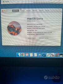 Vendo iMac 21.5" Late 2013 in perfette condizioni di funzionamento, appena revisionato e pronto all’uso. Caratteristiche principali: * CPU: Intel Core i5 2.9 GHz * RAM: 16 GB (espansa) * GPU: NVIDIA GeForce GT 750M dedicata * Storage: HDD 1 TB appena revisionato * OS: attualmente installato OS X Mountain Lion dopo factory reset (con Internet Recovery), aggiornabile fino a macOS Sierra e oltre * Display: 21.5" Full HD Nonostante l'età, è ancora perfettamente utilizzabile per molte applicazioni quotidiane: navigazione, suite Office, montaggio leggero, musica, visual design di base, streaming, ecc. Mac sempre tenuto con cura, ideale come seconda macchina o per chi cerca un fisso affidabile a basso costo con un display ECCELLENTE Preferibile consegna a mano in zona triveneto, Friuli Venezia Giulia e limitrofe