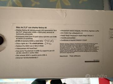 Vendo per passaggio al nuovo un iMac 21,5” retina 4k del 2019, condizioni ottime tenuto perfettamente con specifiche come da foto, ho portato la ram da 8gb a 16gb e sostituito l’hd da 1 tera originale con un ssd samsung sempre da 1 tera. Completo di scatola, imballo, tastiera e mouse originali. Non spedisco, solo scambio a mano. 400 euro