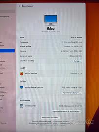 Vendo iMac 21,5" Retina 4K acquistato a dicembre 2019, perfettamente funzionante e tenuto con grande cura, sempre usato in ambiente domestico non fumatori. Specifiche: • Display Retina 4K 21,5" • Processore Intel Core i5 6-core 3.0 GHz • 8 GB RAM DDR4 • Fusion Drive 1 TB • Scheda grafica Radeon Pro 560X 4 GB • macOS installato e pronto all'uso Inclusi: • Apple Magic Keyboard originale • Apple Magic Trackpad originale • Cavo di alimentazione