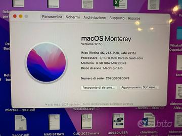Vendo causa inutilizzo imac 21.5 pollici retina 4k late 2015. Processore Intel core i5 quad core 3.1ghz. 8gb ram. Hard disk 1tb ssd. Tastiera e mouse originali. Ottime condizioni. Inizializzato.