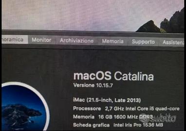 Ciao, vendo iMac 21,5 2013 con 16 gb di ram e 256 SSD (come da foto). Vendo con scatola e imballaggio originale, utilizzato veramente pochissimo. E un iMac molto veloce e fluido nel'utilizzo. Non presenta assolutamente alcun graffio, per foto più dettagliate o maggiori informazioni non esitate contattarmi al 3661963716 oppure a scrivermi via mail. Vendo a euro 420 Grazie.