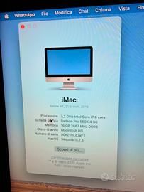 Vendo iMac completo di magic mouse e tastiera. Acquistato nel 2019, processore Intel i7, RAM 16GB. Perfettamente funzionante, vendo per passaggio a Macbook con monitor esterno. Scambio a mano perché non ho una scatola adatta alla spedizione.