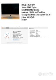 IMAC 24 - INIZIO 2009 Sistema: OS X El Capitan Ram: 8 GB DDR3 a 1067MHz Processore: 2,93 GHz Intel Core 2 DuoScheda grafica: NVIDIA GeForce GT 120 256 Mb N.Serie: W8904FA0TL HD: 500