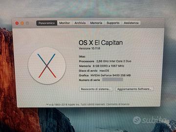 iMac 24” Early 2009 9,1 OSX El Capitan Processore 2,66 Ghz Intel Core 2 Duo Memoria 8 GB DDR3 Scheda Video GeForce 9400 256 MB —— Funzionante, presentano regolari segni di usura, schermo lievemente ombreggiato. —— Consegna a mano tutti i giorni dopo le 19 zona Vomero