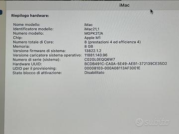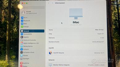 Vendo iMac 24” con chip M1 – Ottimo stato, prezzo ribassato per piccolo difetto estetico Vendo Apple iMac 24" M1 (modello 2021) colore Blu. Caratteristiche: - Chip M1 - 8 GB RAM - SSD 256 GB - 4 porte USB - Scatola originale Acquistato da Unieuro (Misano Adriatico). Ricevuta non garantita. Accessori inclusi: - Magic Mouse originale Apple (bianco) - Alimentatore originale Apple - Tastiera compatibile (non originale) Condizioni: Mac tenuto molto bene, nessun graffio evidente. Sempre funzionato perfettamente. Nota importante (trasparenza totale): Da circa 15 giorni sono comparse lievi righe orizzontali nella parte bassa dello schermo. 👉 Il Mac funziona perfettamente, nessun problema di prestazioni. 👉 Difetto visivo limitato alla parte inferiore. Prezzo: 500 € Prezzo già adeguato considerando il difetto. Perfetto per chi vuole un iMac M1 potente spendendo molto meno e non è infastidito da questo dettaglio. Solo ritiro a mano – NO spedizione Contattami per info.