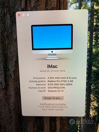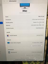 iMac 27” 5K Retina 2019 In condizioni perfette, come nuovo. Vendo per inutilizzo. 1TB = 1000GB memoria totale 8GB RAM (espandibile fino a 64GB) 4GB memoria grafica dedicata Aggiornato a ultima versione di macOS Sequoia. Windows 11 con Office Home 2024 attivato, su seconda partizione con Assistente Boot Camp. Dotazione di Magic Mouse, Magic Trackpad e Magic Keyboard originali.