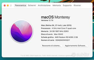 iMac 27 del 2015, processore i7 quad core a 4GHz, con schermo 27 pollici 5k, RAM 24GB, Fusion Drive da 2,12TB (HD meccanico da 2TB + SSD da 128GB), scheda AMD Radeon R9 2GB, tastiera italiana a filo, mouse senza fili e hub Belkin Thunderbolt con cavo e alimentatore.