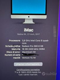 Vendo imac in buone condizioni, i7 , 16 gb ram ssd 500, radeon pro 580 8GB No scatolo, solo pc senza tastiera e mouse. Scambio con ipad 12.9 5 gen