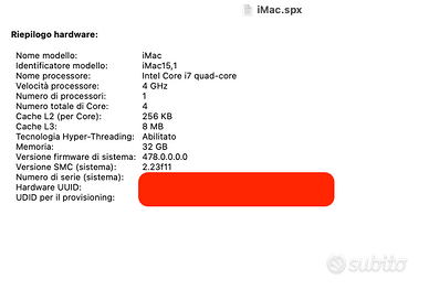 iMac15,1, Intel Core i7 quad-core, 4 GHz (Overclocking fino a 4,4 GHz), Hyper-Threading Abilitato, RAM 32 GB
