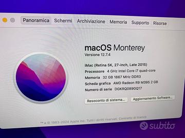 Vendo Imac 27 pollici 5K fine 2015, processore intel quad core I7 a 4 ghz, 32 GB di ram DDR3 a 1867 ghz e SSD da 1 TB. Vendo completo di tastiera apple magic layout US e apple magic mouse. OS Monterey. Schermo intatto e senza pixel bruciati
