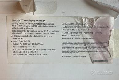 IMac 27" del 2019 tenuto come nuovo, sempre aggiornato • Display Retina 5K retroilluminato LED panoramico 16:9 da 27" (diagonale); 5120 x 2880 pixel; sensore di luminosità ambientale • Processore Intel Core i5 hexa-core a 3,1 GHz con 9 MB di cache L3 condivisa (Turbo Boost fino a 4,3 GHZ) • 8 GB di memoria DDR4 a 2666 MHz; supporta fino a 64 GB • Fusion Drive da 1 TB • Radeon Pro 575X con 4 GB di VRAM • Videocamera HD FaceTime* • Due porte Thunderbolt 3 (USB-C); supporto per I/O ad alta velocità e uscita video • Slot scheda SDXC e quattro porte USB-A • Apple Magic Keyboard e Apple Magic Mouse 2 • MacOS Sonoma 14.5 No spedizione. Vendo tutto insieme. Valuto offerte non ridicole (e sì, 500€ è un’offerta ridicola).