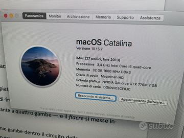 Vendo un vecchio Imac del 2013 ma perfettamente funzionante per passaggio al nuovo processore Apple per motivi di lavoro. Le caratteristiche del computer sono indicate nella relativa immagine che fa intuire che è ancora in uso. Non sono inclusi né tastiera né mouse (salvo accordi) SOLO RITIRO IN SEDE ZONA PORTA VENEZIA