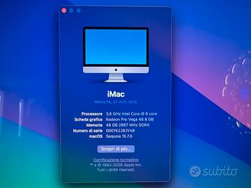 Vendo iMac 27 pollici 5K perfettamete funzionante e senza nessun segno di usura. Il computer è molto performante e aggiornato. Processore Intel i9 3,6mhz 8 core Scheda video Radeon pro vega 48 8gb Ssd 512 48 gb ram Completo di scatola e accessori originali. Ottimo per elaborazione foto e montaggi video 4k