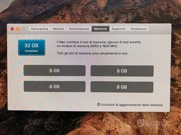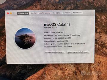 Vendo iMac 27 pollici fine 2012, 32gb RAM, SSD 500gb + 128GB memoria flash Scheda video NVIDIA GTX 675MX 1GB In buonissime condizioni, qualche graffio sul retro in prossimità delle porte usb. Leggeri aloni sullo schermo in basso a destra e sinistra come si vede nelle foto, che si notano praticamente solo all'accensione con lo schermo bianco.