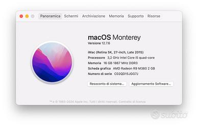 Imac 27 pollici, schermo retina 5k, 16 gb ram e 2tb ssd. Processore intel i5 3.2 GHz Modello iMac 17.1 - A1419 Completo di magic mouse, magic keyboard, cavo d’alimentazione e imballi originali