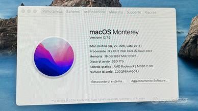 Vendo questo iMac 27 pollici con display Retina 5K. Nonostante il tempo, resta una macchina velocissima e affidabile per l'uso quotidiano, grazie al processore i5, ai 16GB di RAM già installati e al generoso hdd da 1TB.