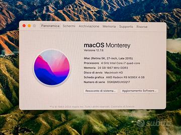 Vendo iMac 27″ Retina 5K Late 2015, in ottime condizioni, perfettamente funzionante e senza difetti estetici o hardware.