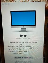 Per cessata attivita vendo imac 27 pollici 3,8 ghz intel core i5 quad core 8 Gb 2400 Mhz DDR4 Hd sostituito da due mesi con Crucial BX500 SATA SSD 1TB per velocizzarlo. Compreso di imballo originale. fatturabile. Possibile spedizione su richiesta