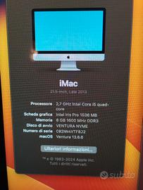 š¶ iMac 21.5" Late 2013 ā i5 / 8GB / SSD NVMe / macOS Ventura š Perfetto per produzione musicale ā (Logic Pro X incluso) Vendo Apple iMac 21.5" ottimizzato per la produzione musicale e la creativitĆ digitale. Grazie allāSSD NVMe da 500 GB e allāaggiornamento a macOS Ventura, questo iMac ĆØ veloce, silenzioso e pronto per lavorare con i principali software audio. š§ Ideale per: Logic Pro X Ableton Live GarageBand FL Studio, Reaper, Audacity e altri DAW āļø Caratteristiche tecniche: CPU: Intel Core i5 quad-core da 2.7 GHz RAM: 8 GB DDR3 1600 MHz Grafica: Intel Iris Pro 1536 MB Storage: ⢠SSD NVMe da 500 GB (macOS installato ā rapidissimo) ⢠HDD secondario da 1 TB (per librerie, sample, progetti) macOS Ventura 13.6.6 installato ā Compatibile anche con macOS Sonoma e versioni future tramite OpenCore Legacy Patcher š Software compatibili testati: Logic Pro X gira fluido anche con progetti multipista Ableton Live stabile con effetti, VST e controller MIDI Ottimo anche per editing video leggero con iMovie o DaVinci Resolve š Inclusi: Tastiera Apple Wireless originale Alimentatore Tutto pronto allāuso ā accendi e crea! š§¼ Il Mac ĆØ stato pulito internamente, SSD nuovo, silenzioso e reattivo. Ideale per home studio, DJ setup, podcasting o scuola di musica. š° Prezzo: 165⬠š Ritiro a mano zona Rho (MI) š Spedizione possibile a carico dellāacquirente, imballaggio sicuro š© Scrivimi per info o per provarlo dal vivo. No perditempo ā solo realmete interessati