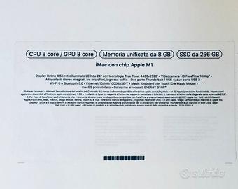 Vendo iMac 4.5k retina M1 8-core cpu 8-core 256gb in perfette condizioni, pari al nuovo ! Con tastiera Touch ID e Magic Mouse 2 . Non scendo oltre il prezzo proposto perche il prodotto è praticamente niovo , usato pochissimo . Tenuto maniacalmente.