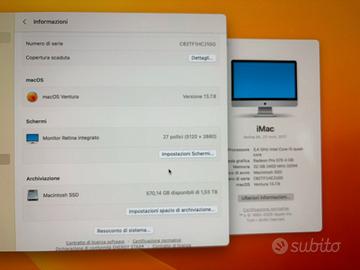 iMac 27” 5K (2017) – 32GB RAM – SSD 1TB – Ottime condizioni Descrizione: Vendo iMac 27" 5K 2017 in ottime condizioni estetiche e perfettamente funzionante. Aggiornato a macOS Ventura 13.7.8 Specifiche: Processore Intel i5 3.4 GHz quad-core Scheda grafica Radeon Pro 570 (4 GB) RAM 32 GB SSD 1 TB (velocissimo) Display Retina 5K 27” (come nuovo) Perfetto per: lavoro d’ufficio e smart working editing fotografico e uso creativo leggero navigazione e multimedia Nessun graffio, sempre usato con cura. 📍 Consegna a mano in zona Lodi, Piacenza, Cremona ❗ Mouse e tastiera NON inclusi