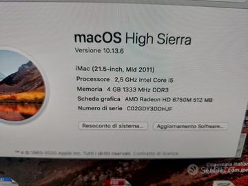Descrizione: Vendo iMac 21,5″ con macOS High Sierra, completo e perfettamente funzionante. CPU 2,5GHz Intel Core i5 4GB RAM Tutte le porte USB e LAN funzionanti (caratteristica ormai rara sui modelli più recenti) Ottime condizioni estetiche e tecniche Possibilità di qualsiasi prova Motivo della vendita: inutilizzo.