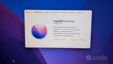 iMac 27" Retina 5K (Fine 2015) - Display 5K AMD Radeon R9 M390 2GB i5 a 3.2 MHz 8 GB RAM Formattato a Monterey. Vendo splendido iMac 27 pollici con Display Retina 5K, perfetto per professionisti della grafica, video editing o per chi cerca una postazione desktop elegante e potente. Il computer è in ottime condizioni estetiche e funzionali. Caratteristiche Principali: Display: Retina 5K da 27 pollici con risoluzione incredibile di 5120 x 2880 pixel. Colori brillanti e dettagli nitidissimi. Grafica: Scheda video dedicata AMD Radeon R9 M390 con 2GB di memoria video, ideale per gestire carichi di lavoro grafici e contenuti multimediali in alta risoluzione. Design: Il classico e intramontabile design ultrasottile di Apple in alluminio. Dettagli aggiuntivi: Condizioni: ottime condizioni Accessori inclusi: vendo senza tastiera e mouse che mi tengo Motivo della vendita: passaggio a modello superiore. Disponibile per qualsiasi prova dal vivo a casa mia o scambio a mano zona Vicenza difetto come da ultima foto vetro scheggiato in alto a sinistra spedizione o consegna a mano zona Vicenza o prova a casa mia In altra inserzione un altro imac identico senza difetto