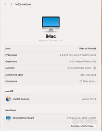 iMac Retina 4K, 21.5-inch, 2017 perfetto condizioni - Processeur : 3,4 GHz Intel Core 15 quatre cœurs - Graphisme: AMD Radeon Polaris 4 Go Mémoire RAM: 8 Go 2400 MHz DDR Disc : 1T