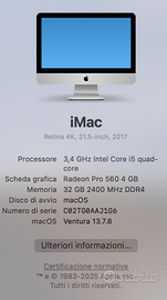 Vendo per cambio a nuovo modello questo iMac 4K Retina da 21.5 pollici con processore Intel Core i5 da 3,4 GHz disco interno da 1TB e 32GB di RAM perfettamente funzionante e in ottime condizioni corredato da tastiera bluetooth estesa (italiano), magic mouse e imballi originali.