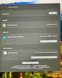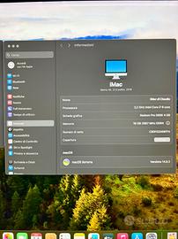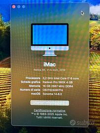 iMac Processore : 3,2 GHz Intel Core i7 6 core Scheda grafica : Radeon Pro 560X 4 GB Memoria : 16 GB 2667 MHz DDR4 macOS Sonoma : versione 14.8.3 250 GB Monitor Retina integrato 21,5 pollici (4096 x 2304) Tastiera Apple e Mouse Apple bianchi originali