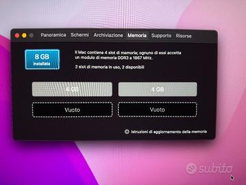 Processore 3,2Ghz i5 QuadCore 8Gb Ram 1867Mhz DDR3 (2 banchi da 4GB, upgradabile, 4 slot totali) Scheda video AMD Radeon R9 M380 2GB Eseguito Upgrade dischi rigidi, mettendo due SSD samsung da 1TB tra cui uno M2 Mac OS Monterey 12.7.6 già inizializzato e pronto all'uso. Su richiesta posso mettere ultimo OS disponibile Mac OS Sequoia con OpenCore Vendo senza imballo originale, senza tastiera e mouse. Solo ritiro a mano