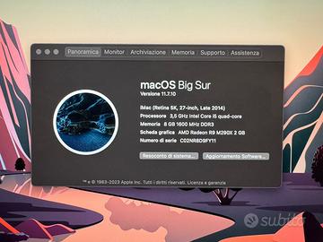 Vendo iMac Retina 5k 27-inch Late 2014 Processore 3,5 Ghz Intel Core i5 quadcore Memoria 8 GB 1600 MHz DDR3 Scheda grafica AMD Radeon R9 M290X 2 GB Ottime condizioni Senza scatola originale Compreso tastiera, mouse e cavo di alimentazione Ritiro a mano su Ravenna