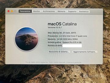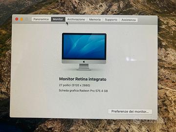 Vendo iMac Retina 5K 27 pollici (5120x2880) del 2017 Processore 4,2 GHz Intel Core i7 quad-core Memoria 24 GB 2400 MHz DDR4 Scheda grafica Radeon Pro 575 4 GB Usato poco Imballaggio originale ma non dotato di tastiera e mouse