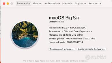 iMac (Retina 5K, 27 pollici, fine 2014) Processore 4 GHz Intel Core i7 quad-core Memoria 25 GB 1333 MHz DDR3 Scheda grafica AMD Radeon R9 M290X 2 GB Numero di serie DGKQ2034FY14 256GbG di Memoria Tastiera e Mousepad Originali