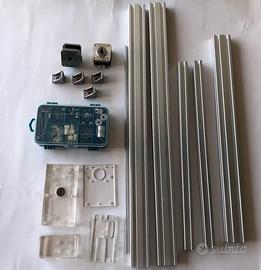 Include tutti i componenti visibili in foto: struttura in alluminio, motori passo-passo, modulo laser con occhiali protettivi, scheda elettronica, alimentatore, cavi, software su CD, staffe, viti, supporti e piastre in acrilico.