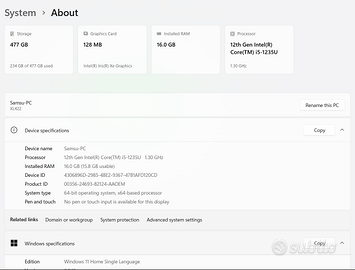 📌 Caratteristiche Principali •Processore: Intel Core di 12ª generazione i7, fino a 4.4GHz in boost   •Memoria: 16GB LPDDR4X RAM, ideale per il multitasking   •Archiviazione: SSD NVMe PCIe 3.0 da 512GB – avvio rapido e accesso veloce ai file •Display: 14″ FHD IPS, 100% sRGB, luminosità 300nits, cornici sottilissime da 4.7mm •Porte: •2 × USB‑A (USB 3.0) •2 × USB‑C (uno con ricarica 65W PD) •Uscita HDMI 1.4 •Lettore microSD •Jack audio combinato 3.5mm •Connettività : Wi‑Fi6, Bluetooth5.1 •Webcam: HD 720p con doppio flash LED “Star Light”—ottima per videochiamate anche in ambienti non perfettamente illuminati  •Audio: Altoparlanti stereo con audio DTS •Tastiera: Retroilluminata, formato chiclet, ideale per lavorare al buio •Batteria & Scocca: Batteria da 50Wh (10‑11h); ricarica rapida con caricatore USB‑C da 65W; scocca in alluminio, spessore 14.8mm, peso 1.24kg 🧼 Condizioni & Contenuto •In ottime condizioni: ben tenuto, pulito, nessun difetto hardware •Incluso 65w caricatore e cavi anker originali Perché Sceglierlo Un notebook elegante, potente e portatile: perfetto per studenti, professionisti, creativi o viaggiatori. Ottime prestazioni, storage veloce, display di qualità , batteria per tutta la giornata e porte moderne—senza dover usare adattatori.