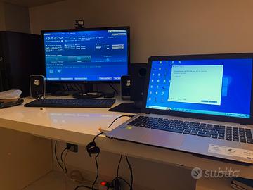 Vendo come da foto 2 PC uno fisso e Uno portatile (funziona solo con alimentazione attaccata) un monitor 26 pollici 2 casse 1 su woofer 1 tastiera seza fili 1mouse senza fili una webcam e un microfono tutto funzionante pronti per studiare , navigare, guardare video e prendere dimestichezza col mezzo. ( i due PC hanno di default Windows 10 e imposta le lingue Italiano e Francese. )